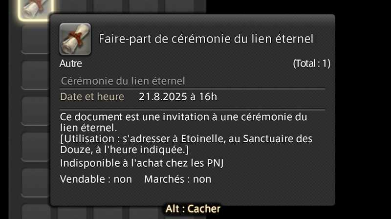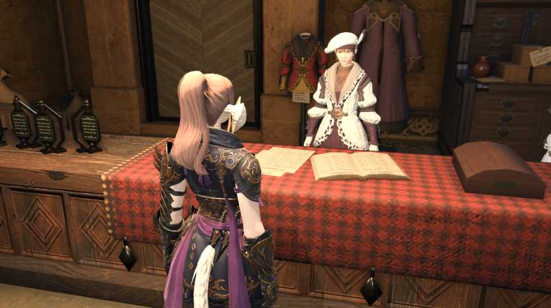 S'ils le désirent, les invités peuvent acheter des tenues spéciales auprès de Rianne, au faubourg de Nald, à Ul'dah (9.8, 9.0).