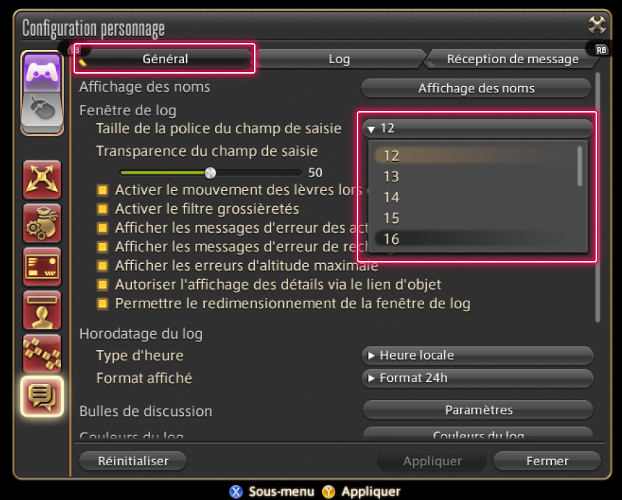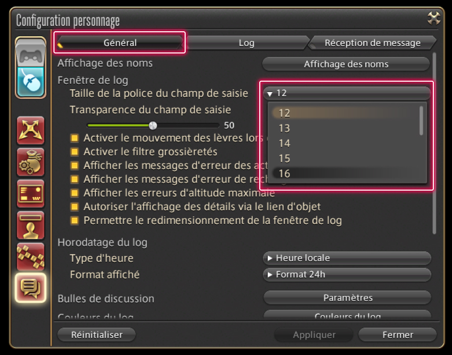 La taille de la police du champ de saisie peut être ajustée à partir du menu Système > Configuration personnage > Fenêtre de log > Log.