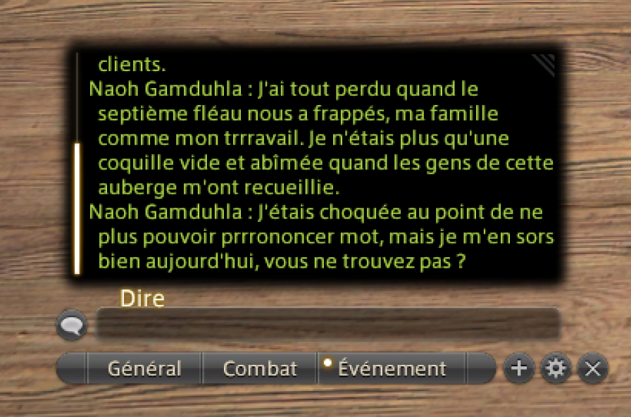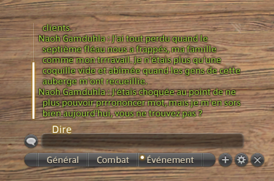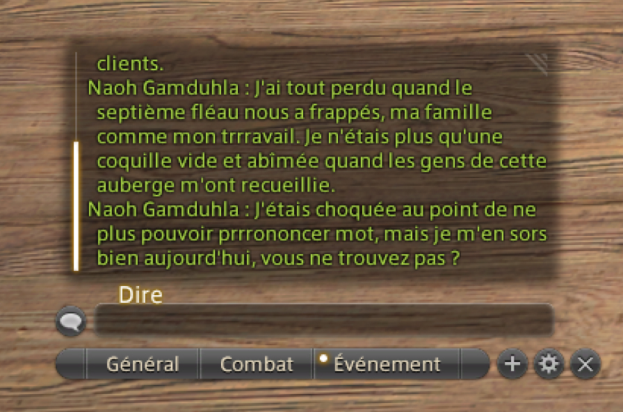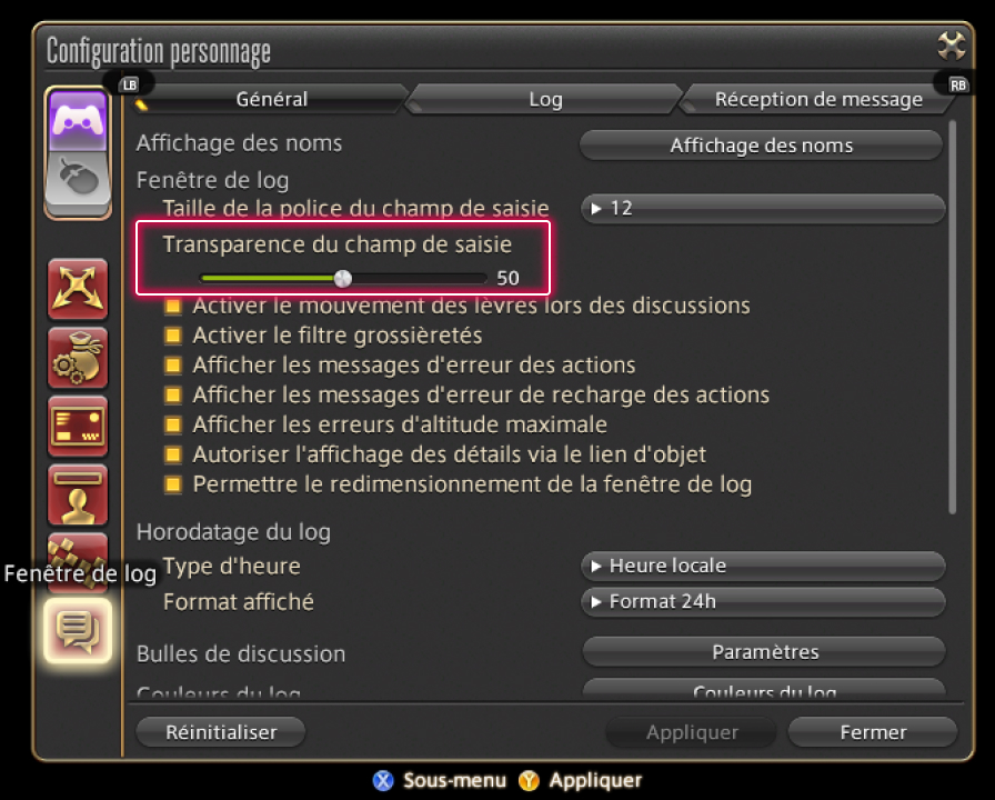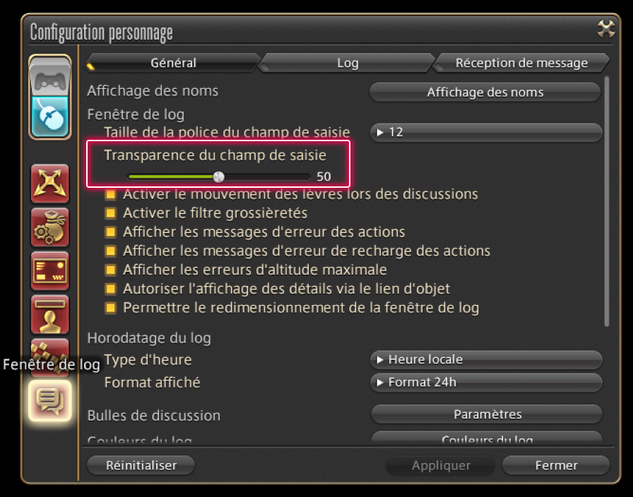 Vous pouvez également ajuster la transparence du champ de saisie de la fenêtre de discussion. Pour ce faire, ouvrez le menu principal > Système > Configuration personnage > Fenêtre de log, puis ajustez l'option idoine dans l'onglet Général, rubrique "Fenêtre de log".