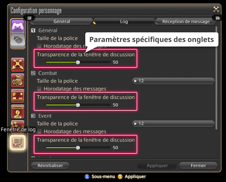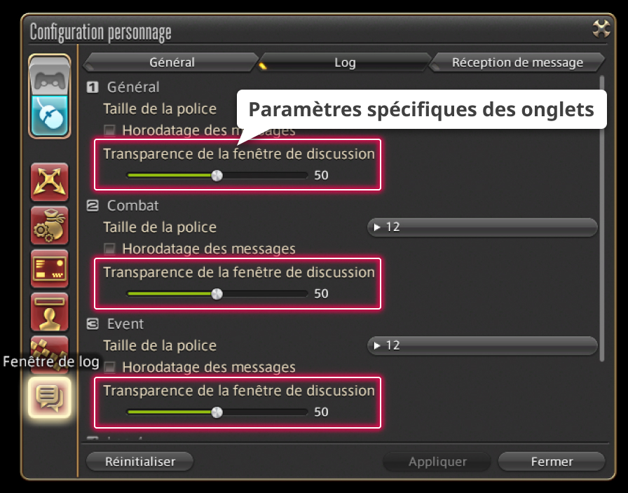Rendez-vous dans le menu principal > Système > Configuration personnage > Fenêtre de log. Une fois dans l'onglet Log, vous pourrez régler la transparence des différents types de fenêtres de discussion.