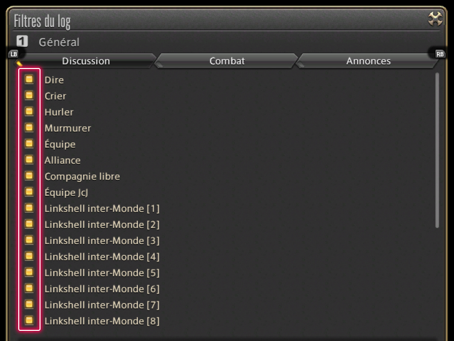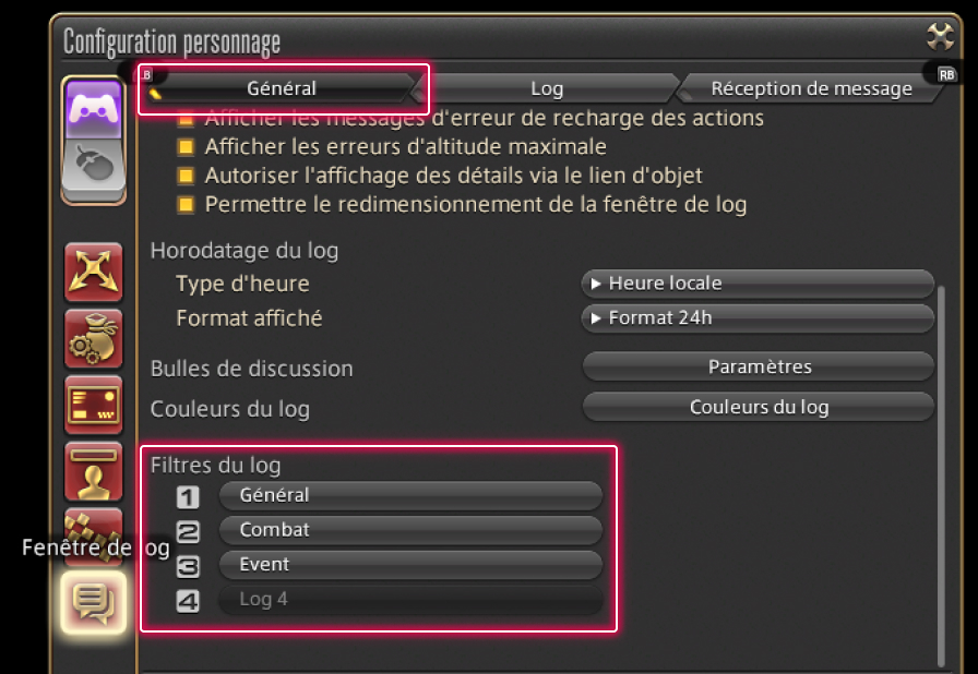 La quantité d'informations qui apparaît dans ces fenêtres peut être réduite en ajustant les paramètres du menu Système > Configuration personnage > Fenêtre de log > Général > Filtres du log.