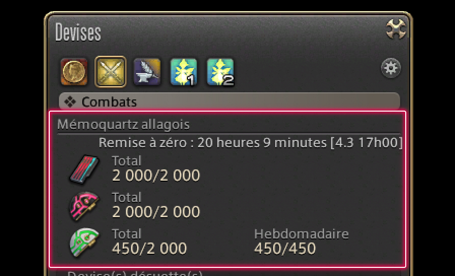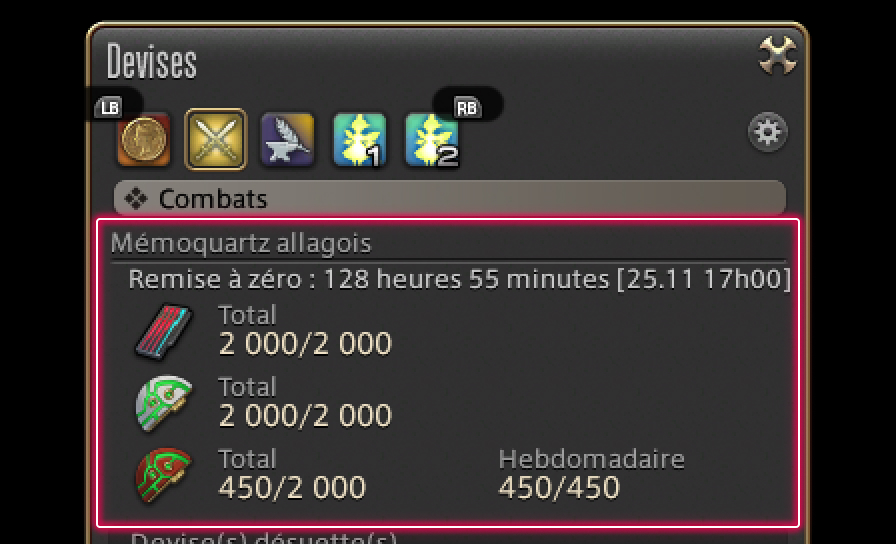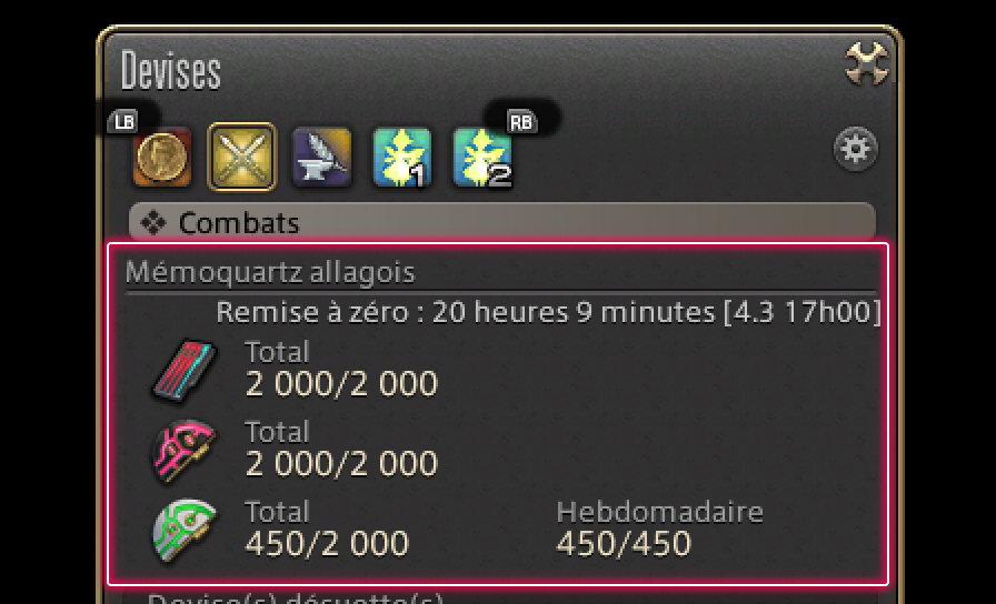 Il est possible de vérifier le nombre de mémoquartz allagois possédés dans le menu Personnage > Devises > Combats. Le temps restant avant la réinitialisation des récompenses hebdomadaires y est également affiché.