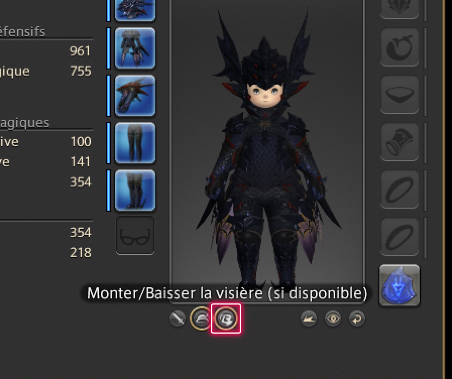 Rien de plus simple, il suffit de se rendre dans le menu Personnage > Personnage et de sélectionner l'option "Monter/Baisser la visière (si disponible)" en bas de la fenêtre d'aperçu de votre personnage.