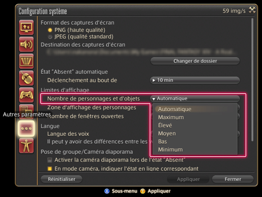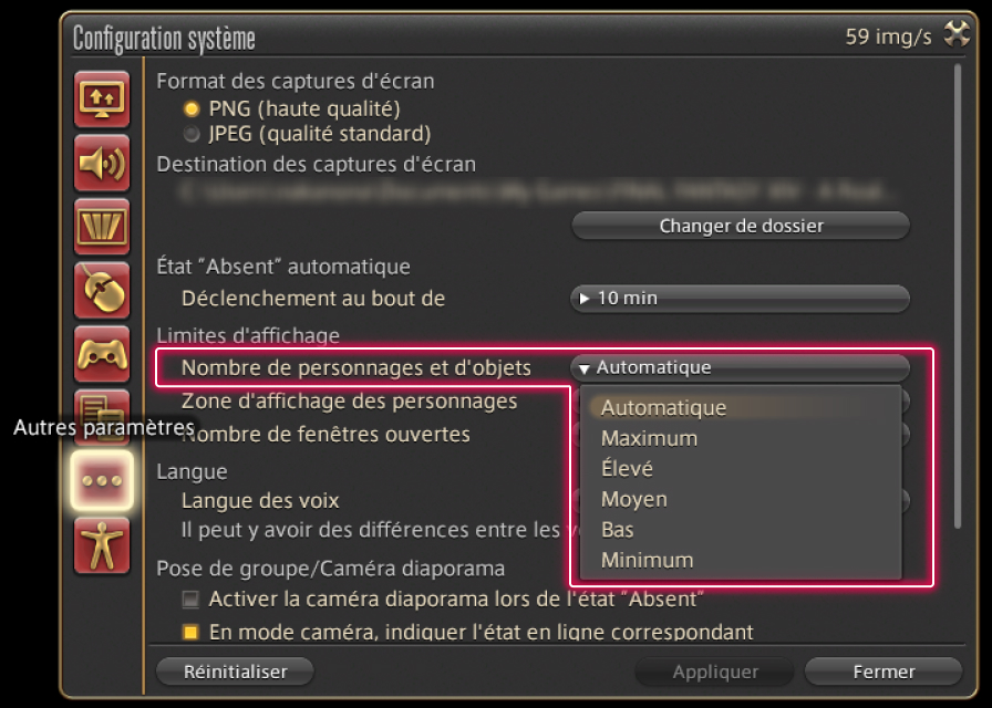 Rendez-vous dans le menu principal > Système > Configuration système > Autres paramètres, puis dans la rubrique "Limites d'affichage". Vous pouvez modifier le nombre de personnages et d'objets affichés à l'aide d'un menu déroulant.