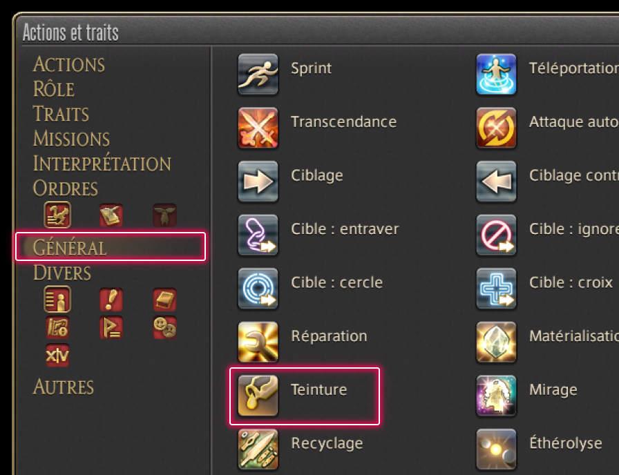 Les teintures sont réparties en différentes catégories selon leur couleur. Une fois la teinture choisie, appuyez sur "Teindre".