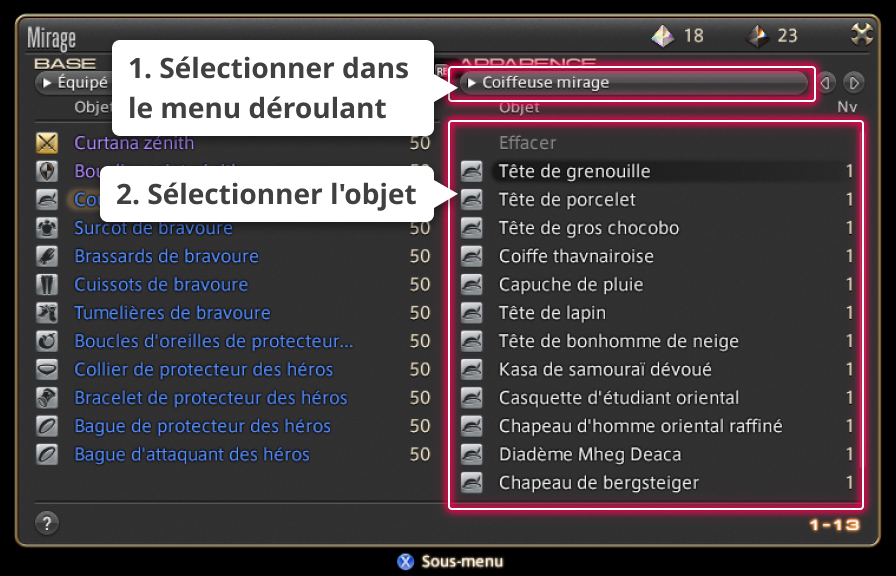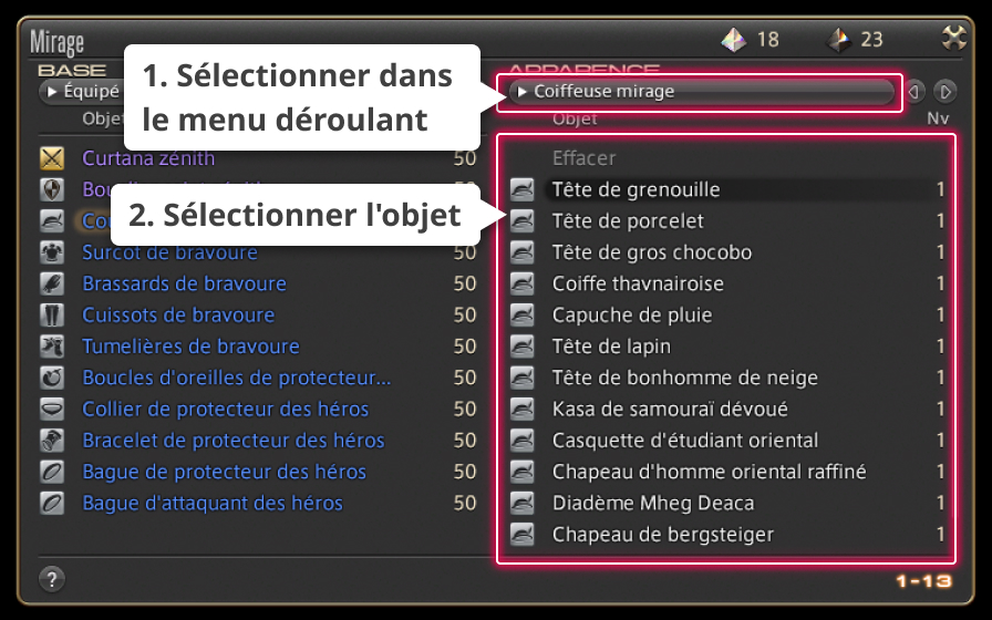 Pour ce faire, vous devez d'abord vous trouver dans une chambre d'auberge. Ensuite, il vous suffit d'ouvrir la fenêtre de mirage via l'action du même nom (disponible dans la fenêtre "Actions et traits") ou le sous-menu correspondant. Enfin, sélectionnez "Coiffeuse mirage" dans le menu déroulant situé en haut à droite, puis choisissez l'objet dont vous souhaitez projeter l'apparence.
