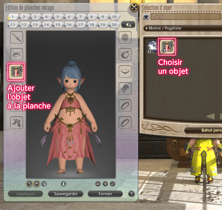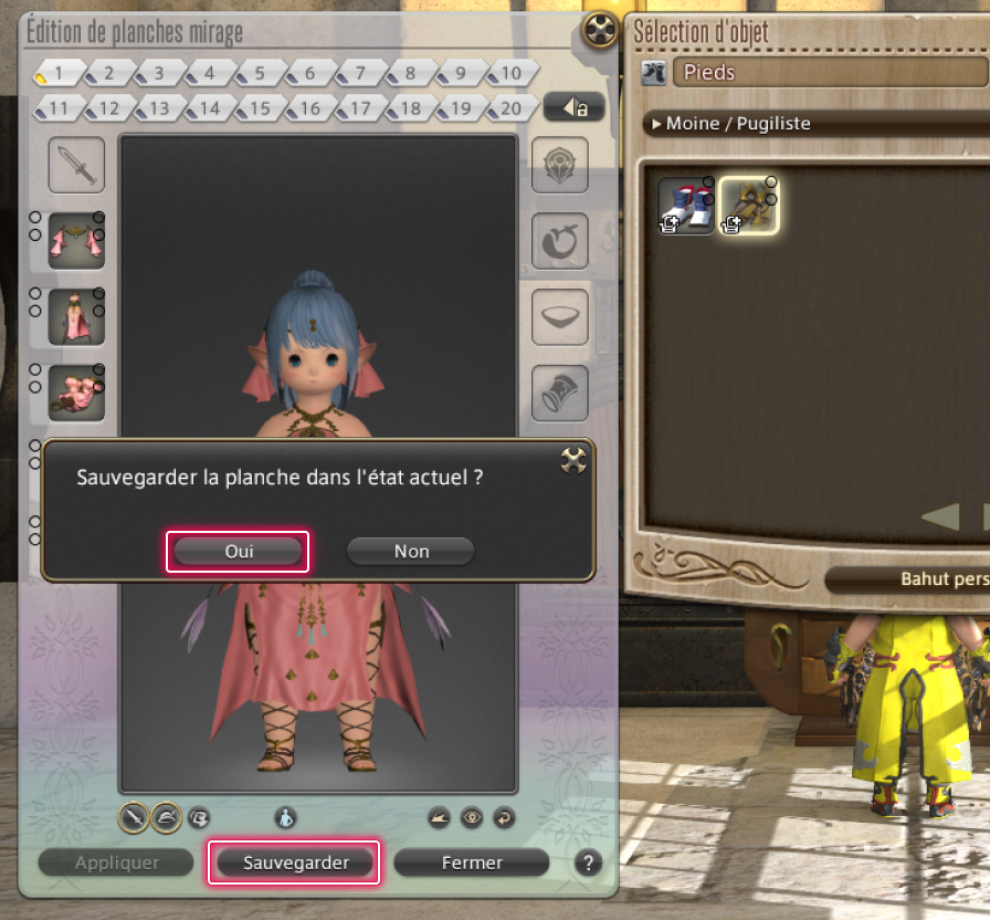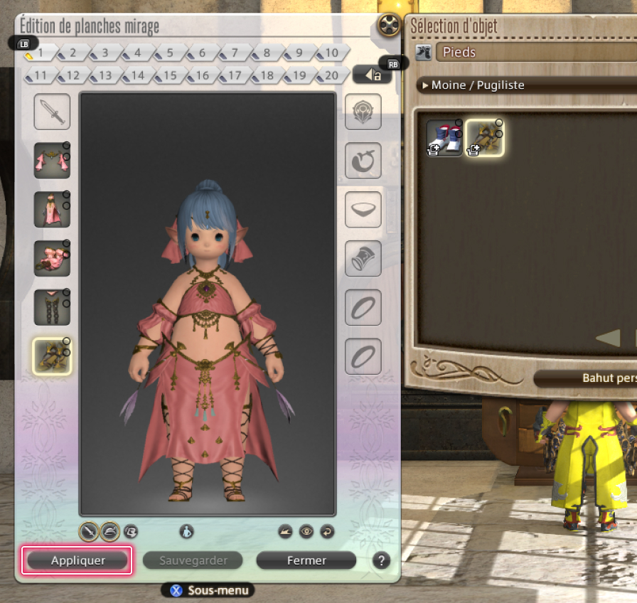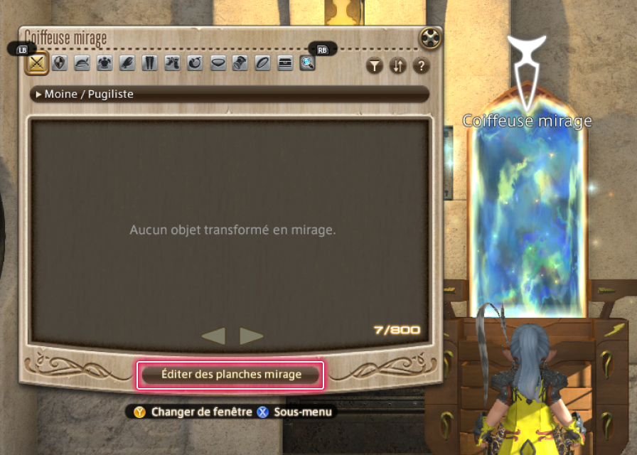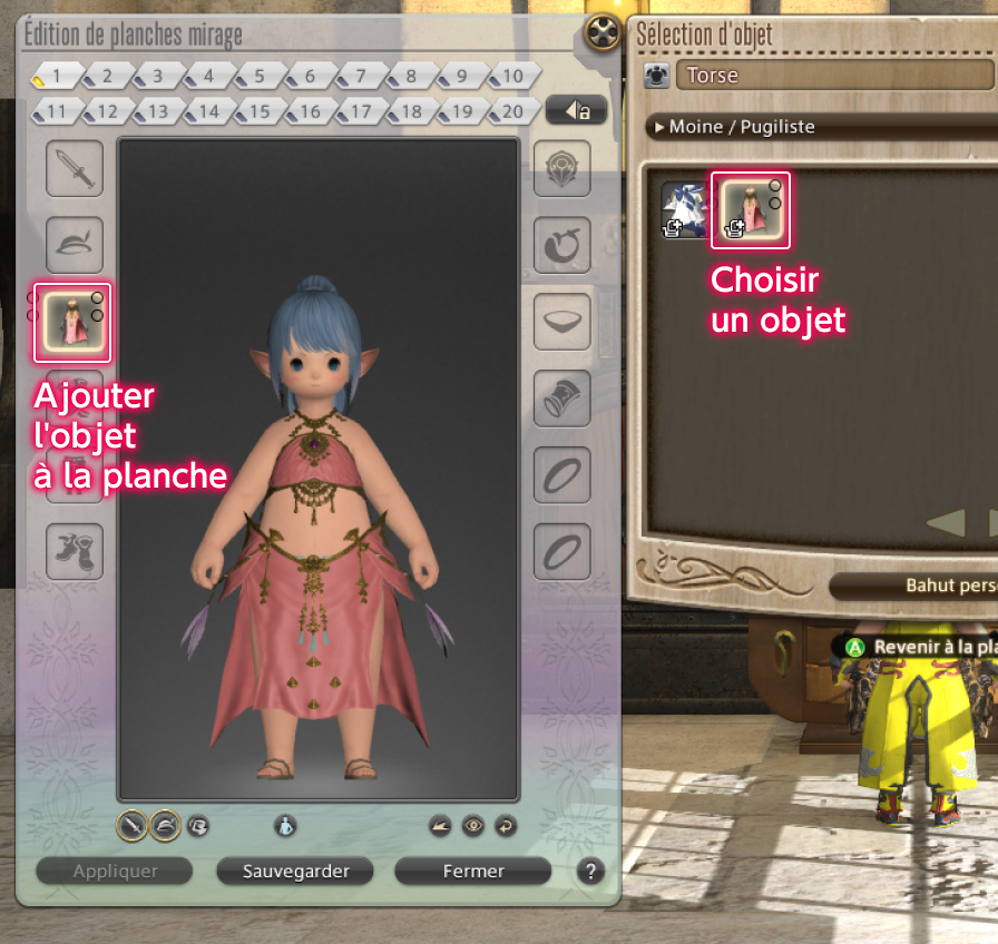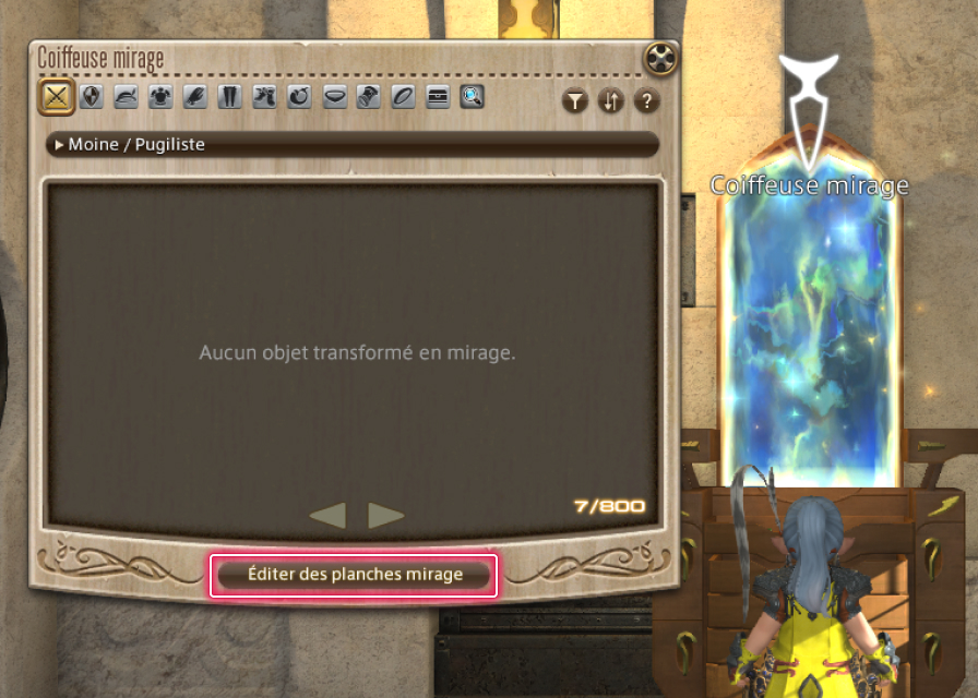 Après avoir transformé des objets en mirages, vous pouvez sauvegarder vos ensembles préférés sur des "planches mirage" et les appliquer simultanément sur une tenue entière.