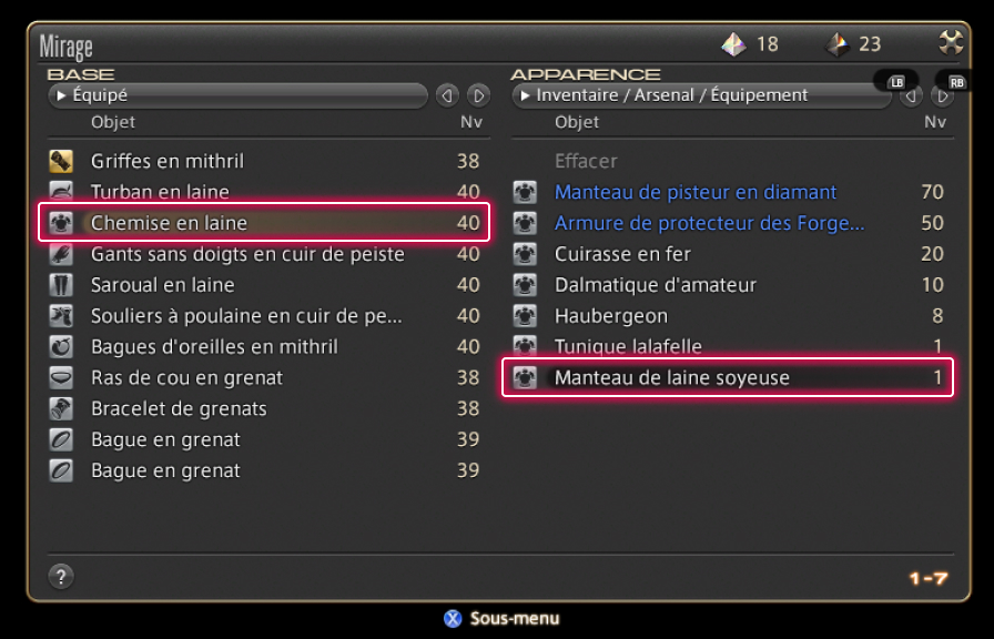 Choisir l'objet puis appuyer sur le bouton X (touche □ sur PS5™/PS4™, touche X sur Xbox Series X|S) pour ouvrir le sous-menu et choisir l'option "Mirage".