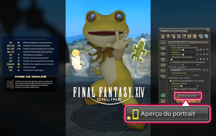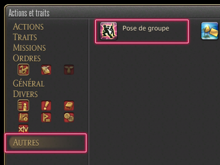 Pour accéder à la pose de groupe, rendez-vous dans le menu Personnage > Actions et traits > Autres, puis cliquez sur l'icone correspondant, ou bien saisissez une des commandes texte suivantes : /posegroupe, /posegr, /grouppose, /gpose.