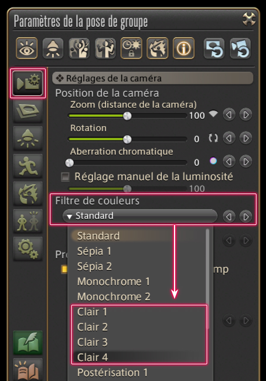 Les filtres de couleurs se trouvent dans Paramètres de la pose de groupe > Général > Filtres de couleurs.
