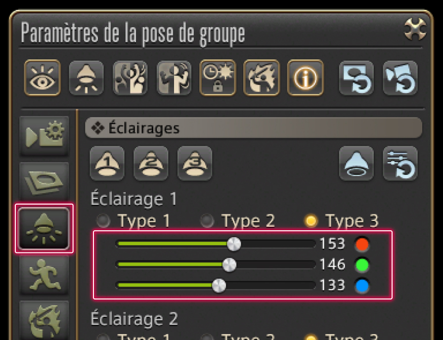 Trois curseurs, un pour chaque couleur, permettent d'ajuster la couleur de chaque éclairage dans le menu Paramètres de la pose de groupe > Éclairages.