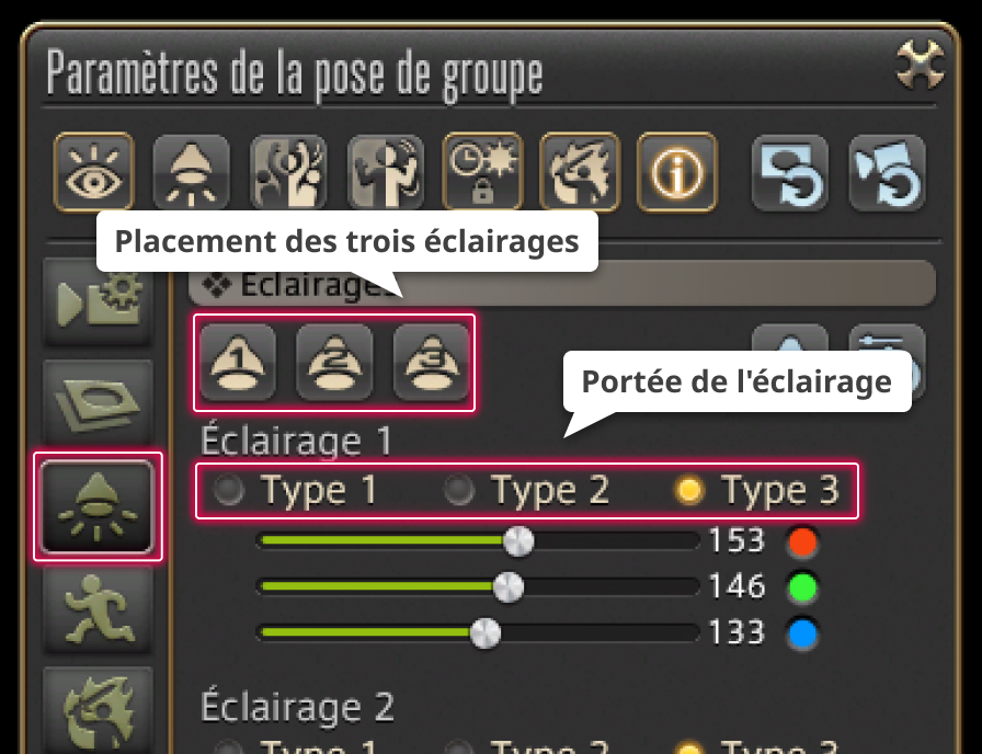Jusqu'à trois éclairages peuvent être placés au sein d'une composition. En outre, leur type détermine leur portée : 1 (courte), 2 (moyenne) et 3 (grande).