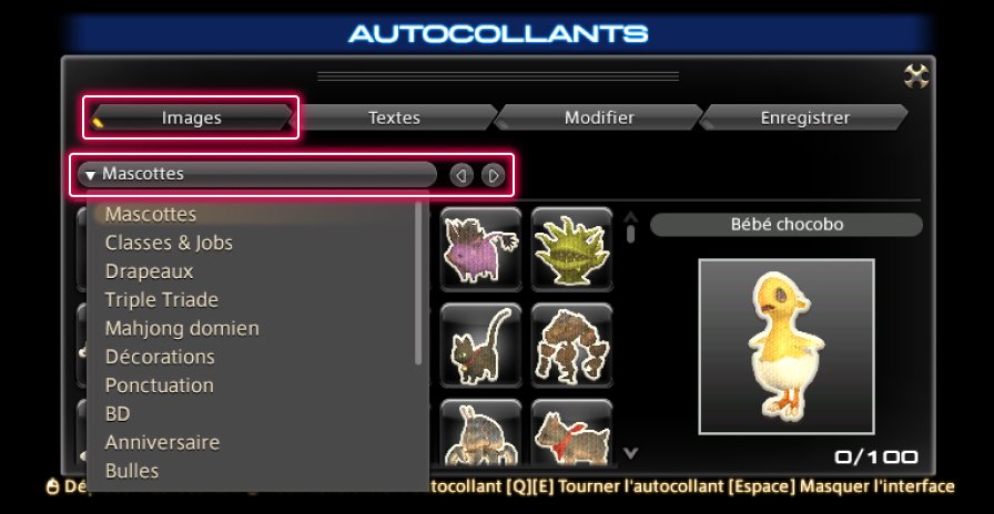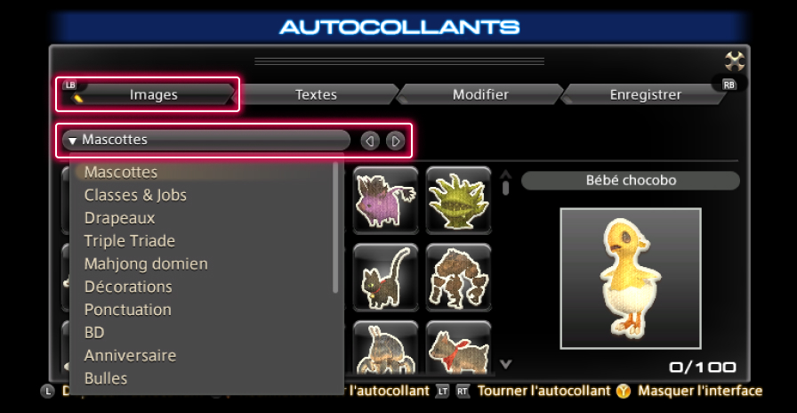 Vous n'avez que l'embarras du choix entre messages, mascottes, drapeaux, symboles, emoji et autres plats bien connus d'Éorzéa. Et comme vous pouvez en apposer jusqu'à 100, il n'y a aucune raison de mettre un frein à votre élan créatif !