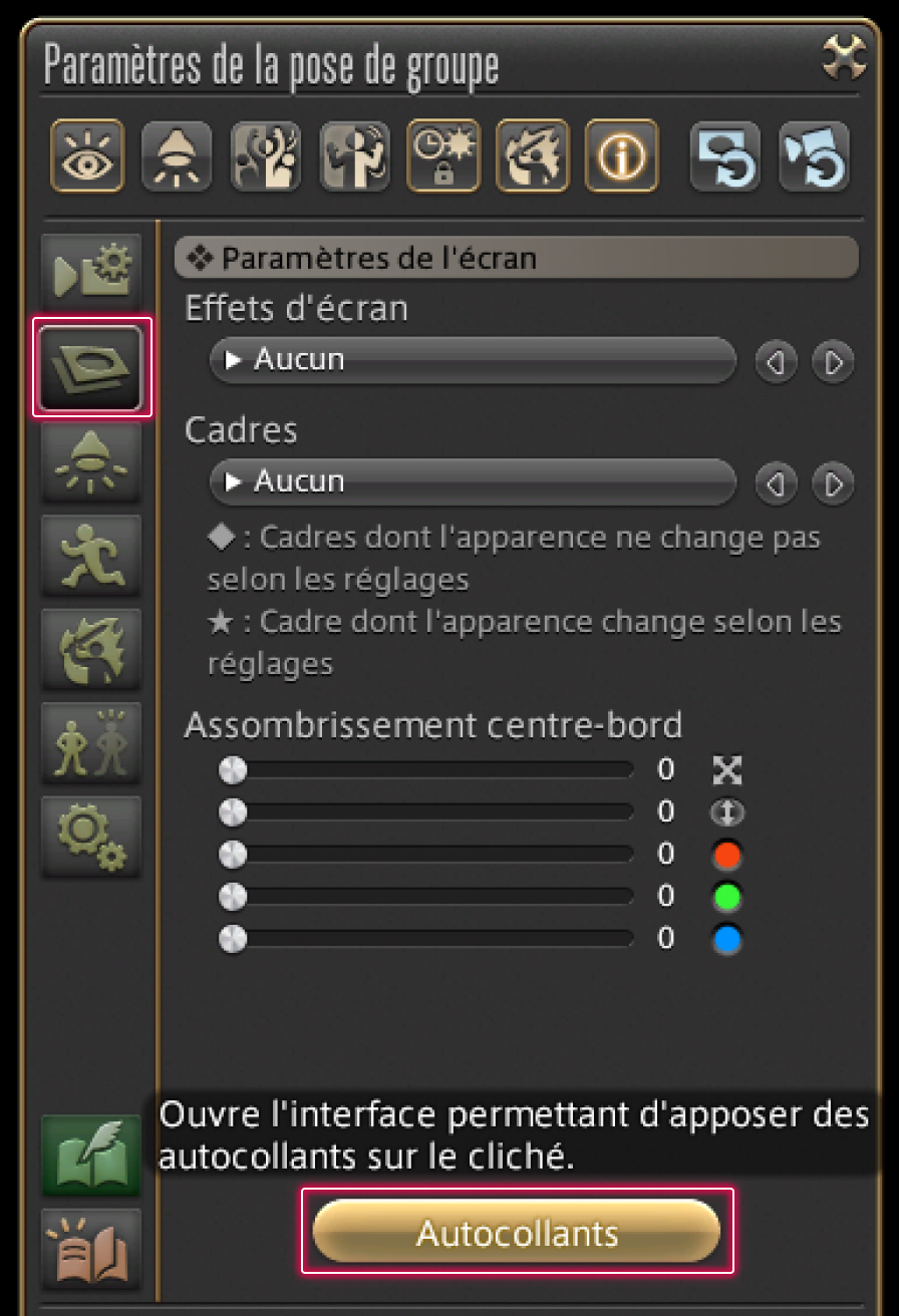 Dans Paramètres de la pose de groupe > Altérations et cadres, cliquez sur le bouton "Autocollants" pour faire apparaître une nouvelle fenêtre.