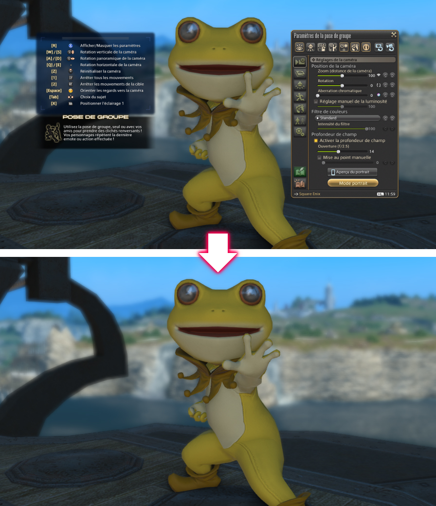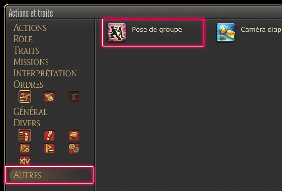 Pour accéder à la pose de groupe, rendez-vous dans le menu Personnage > Actions et traits > Autres, puis cliquez sur l'icone correspondant, ou bien saisissez une des commandes texte suivantes : /posegroupe, /posegr, /grouppose, /gpose.